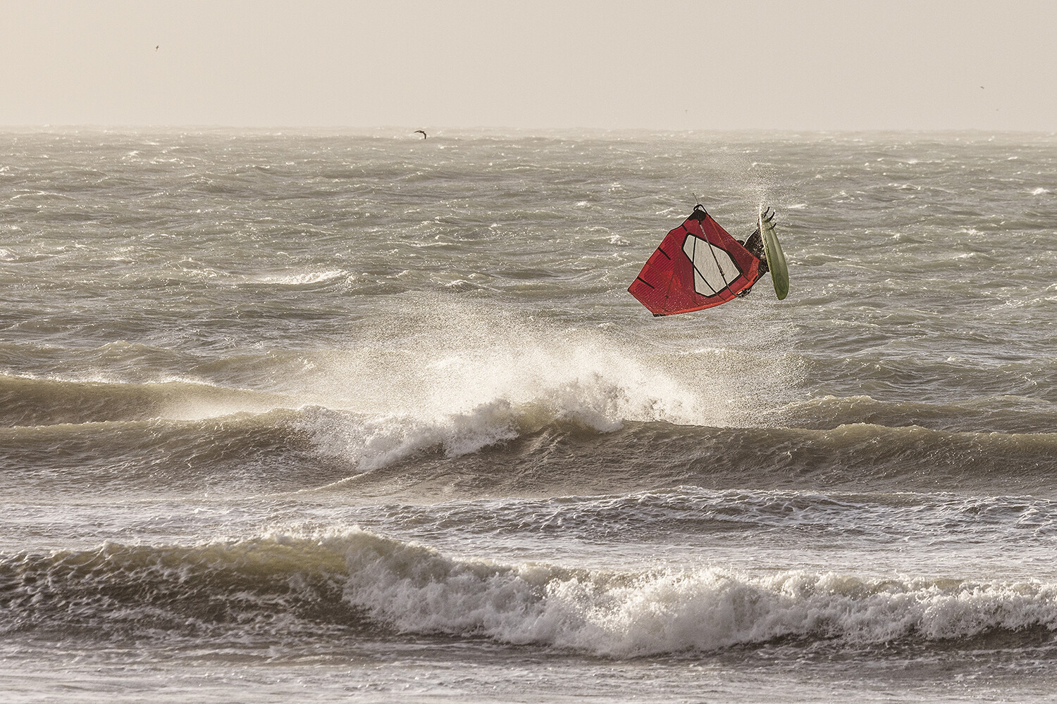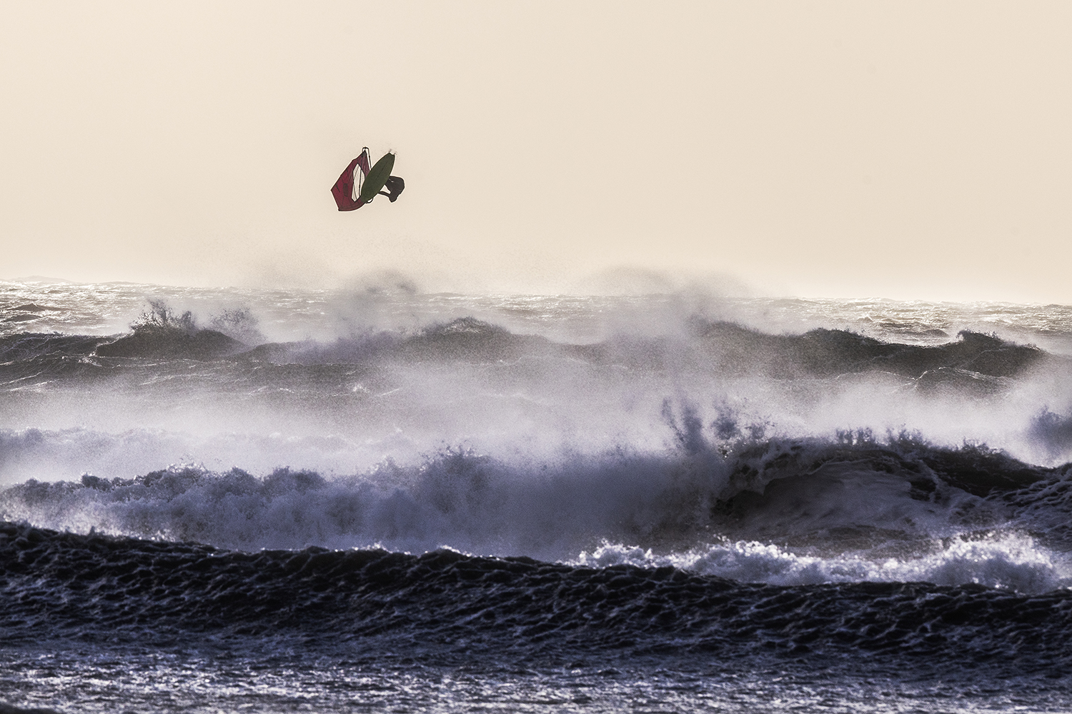 Don’t overdo down haul or over outhaul even in 40 knots! You still need the correct shape in your sail. Don’t be scared to sail fast and use the full force of the wind. Huge floaty rocket airs can go so high in these storms if you can get good board speed and can launch with no fear!