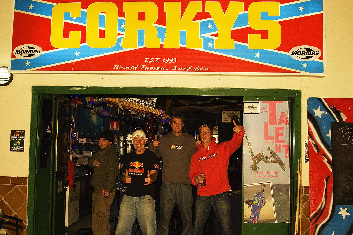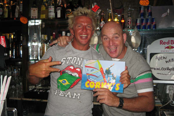 The plan was for it to be a windsurf bar to start with. Just for windsurfers because there were so many windsurfers in town. So, I thought, you know what, we’ll just call it Corky’s, and we’ll try and fill it with everyone that does water sports, boogie boarders, surfers and windsurfers. I managed to get a bit of a deal from Red Bull. So, I was able to push the whole extreme sports videos on all the televisions and things and everyone used to come in after sailing or surfing. It was the place to be. We used to cater for everybody, and it just took off big time. I eventually moved to a bigger bar directly above the first one. And that is where all the water people hung out. It had the pool tables outside, Severne flags and even a dancing pole in the corner for the girls.