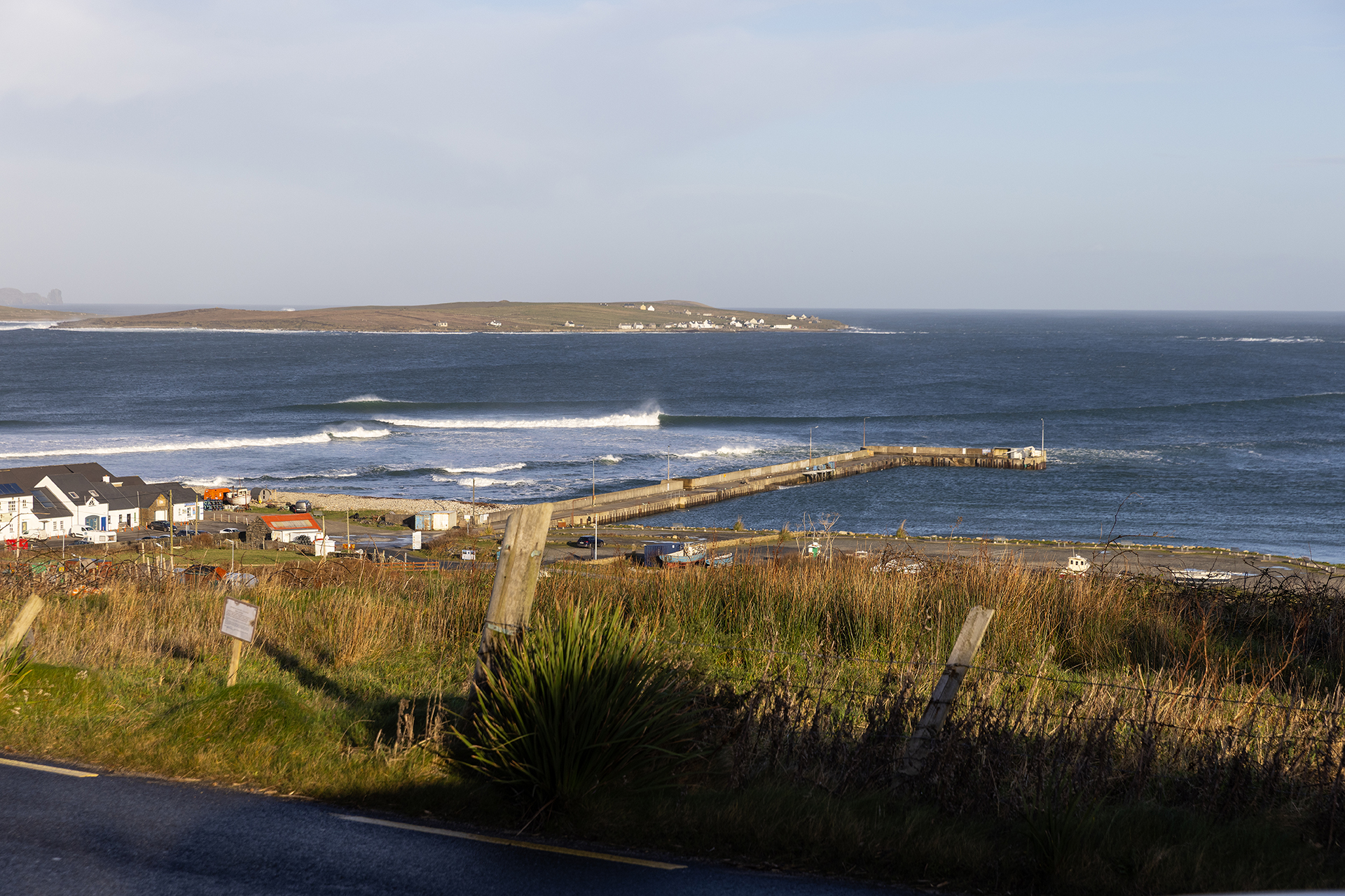 I set up base near the new sauna just left of the harbour and it wasn’t long before Timo was dropping into butter-smooth logo-high waves on the reef. In Ireland, you’re usually lucky to get ten minutes of sun between rain squalls and hail, but today the clouds only drifted in briefly. A December session with sunshine at Magheroarty? Madness.