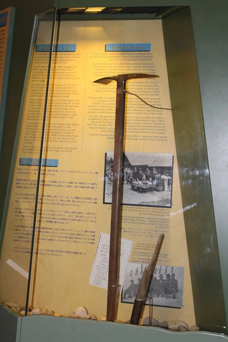 It wasn’t until 1997, during the preparations for the 75th anniversary celebration of the 1925 ascent, that it was discovered that the two pieces – one that had made it to a Jasper museum by way of New York City and the other in Japan – were from the same ice axe. Ceremonies were held in Japan and in Canada joining the two pieces together and they now reside permanently in the Jasper-Yellowhead Museum and Archives as one of the most important symbols of the advancement of mountaineering on the continent.