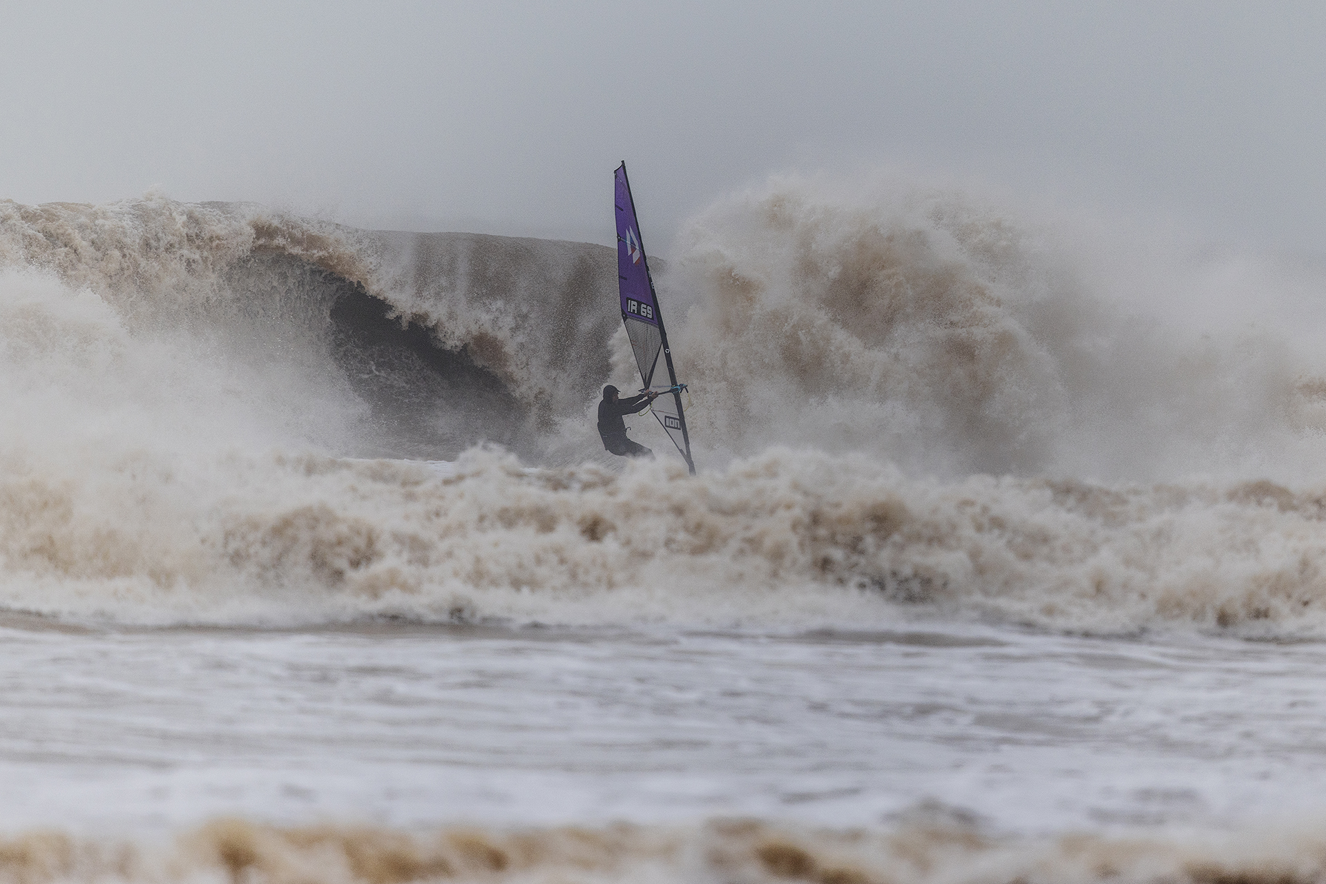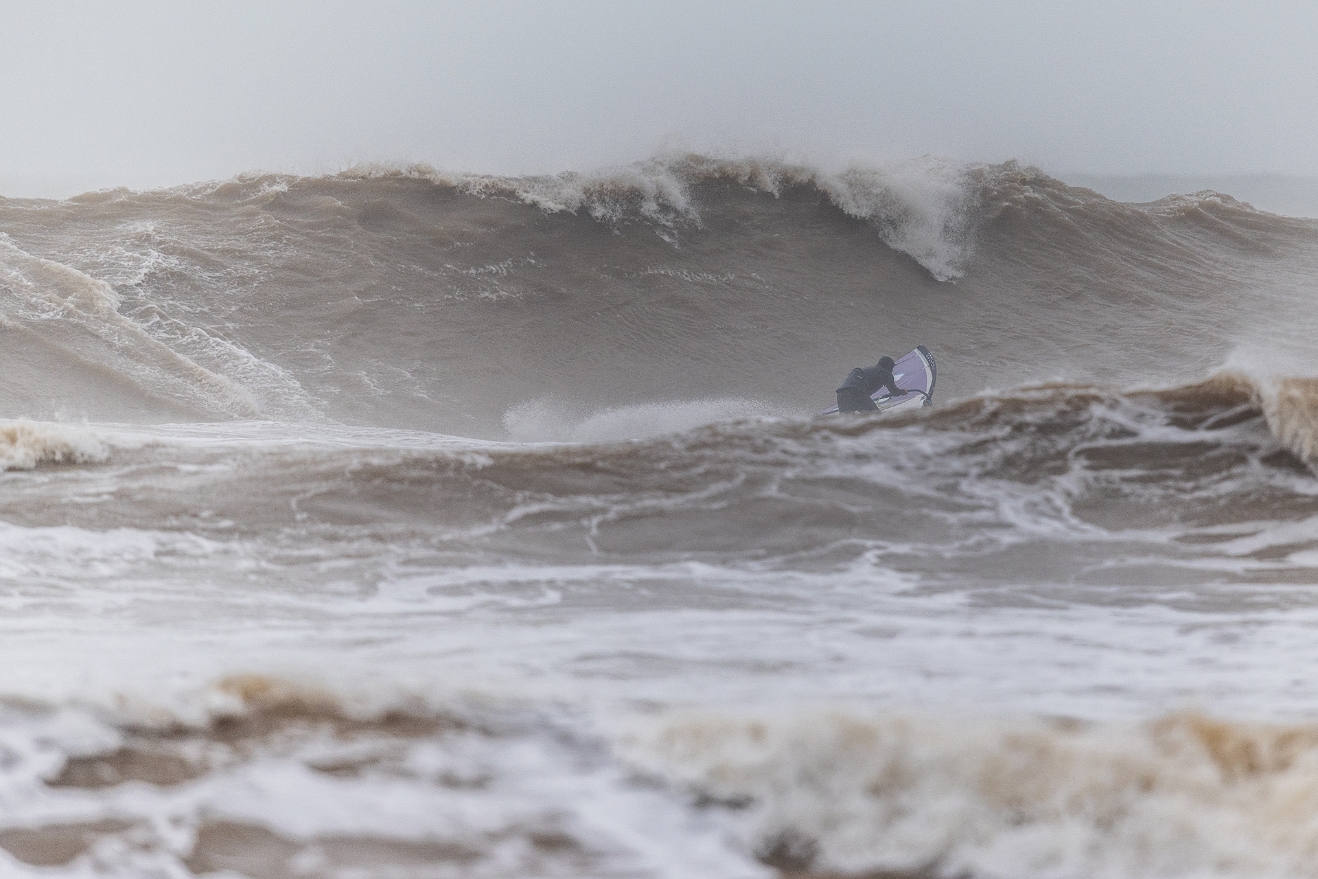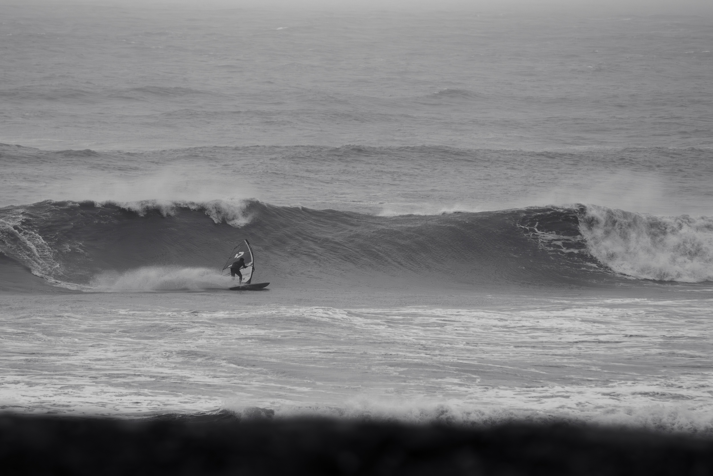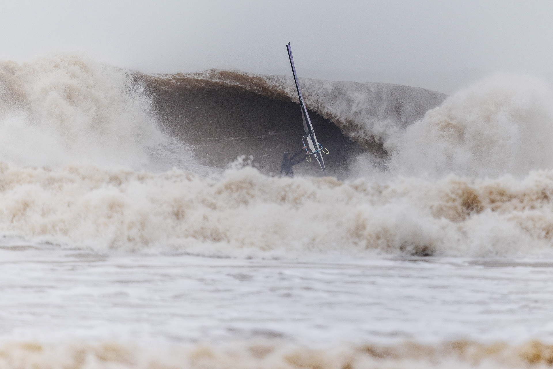Ross arrived around 3:15pm, wasted no time rigging, and charged straight into the chaos. By now the waves were even bigger and heavier…but just to keep things interesting, the wind had started to back off. Ross fought his way out, taking several full-force poundings along the way.