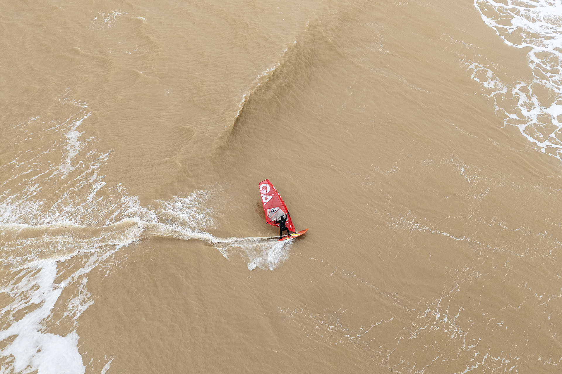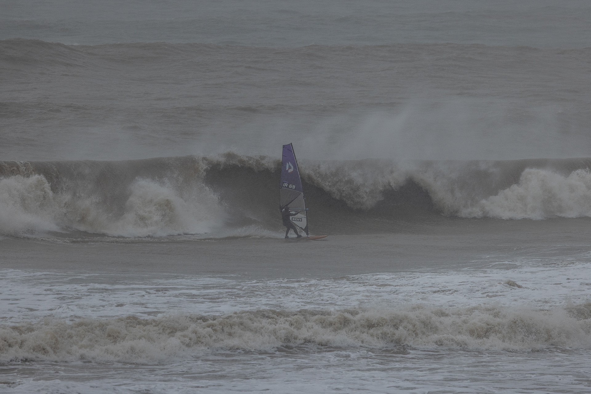 As soon as I arrived, the weather flipped from beautiful to torrential rain and the swell jumped fast…from head high to solid mast high with some bigger sets. I sailed the first hour alone in some seriously heavy waves, thick, unpredictable and exploding on the sandbars at low tide. In hindsight, a three metre swell at 17 seconds really needs a reef, not a beach break, but even if it was too big to do anything truly rad, it was still 100% worth it because nowhere else was happening. It was solid mast high but the lip of the wave was incredibly thick. Low tide made it even more heavy and it was exploding on the sandbar. It was just too big to do anything rad! It was great to visit JC’s home spot for a change and catch up with Ross.