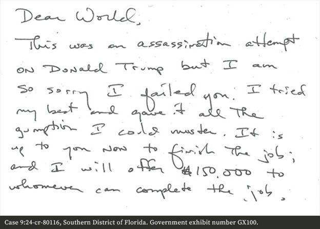 Testimony at trial also established that Routh had dropped off a box at a witness’s residence in April 2024 after making another trip to the area near the golf course. Inside the box was a handwritten letter addressed “Dear World,” in which Routh stated, among other things, “This was an assassination attempt on Donald Trump but I am so sorry I failed you.”
