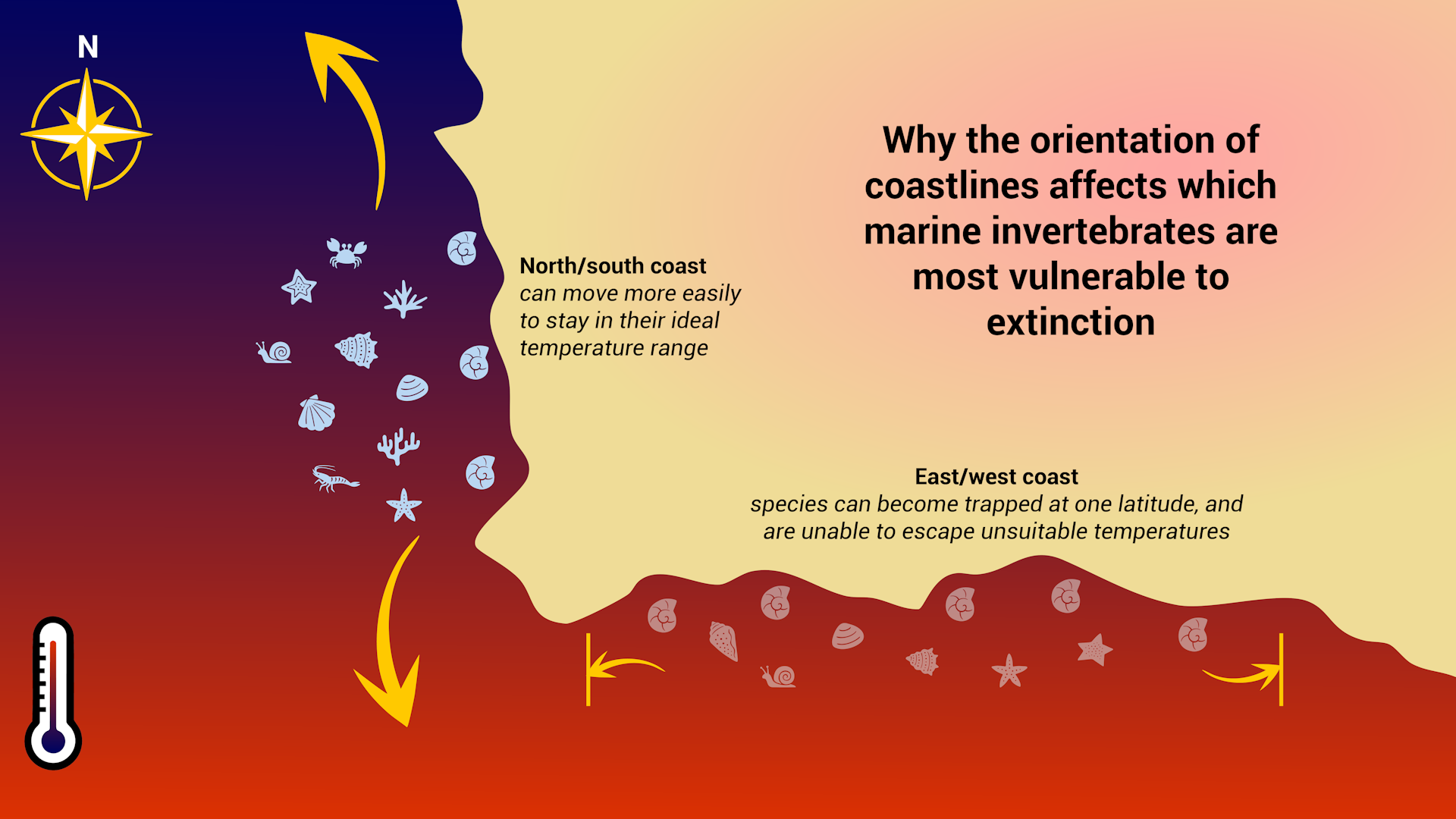 We hypothesised that the shape and orientation of coastlines could help species escape – or trap them. If coastlines provide direct, continuous pathways to move north or south, species should be able to better track shifting climates. But, where species have to travel a long way for minimal latitude gain, their extinction risk is raised during episodes of environmental change.