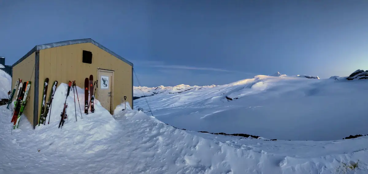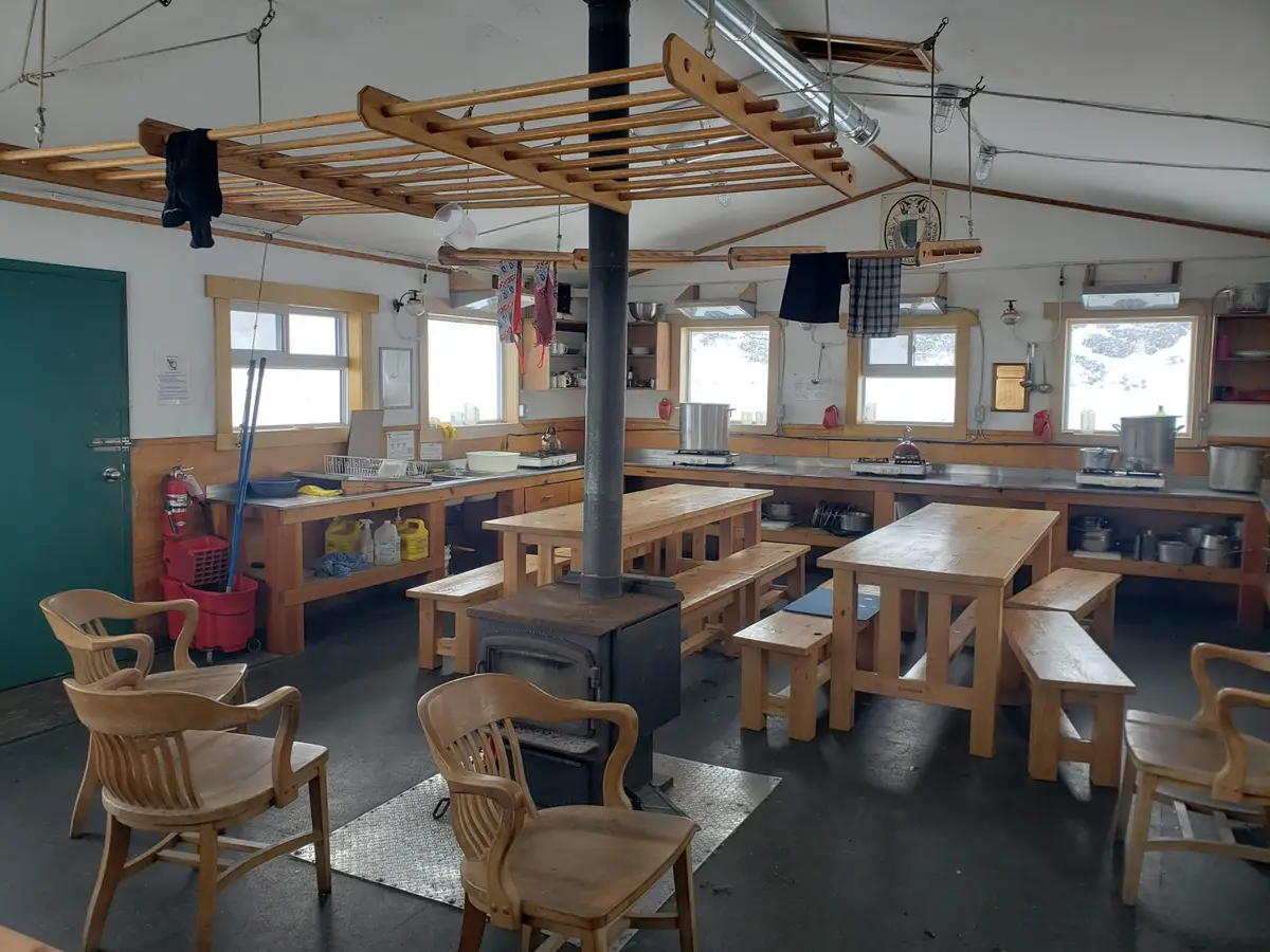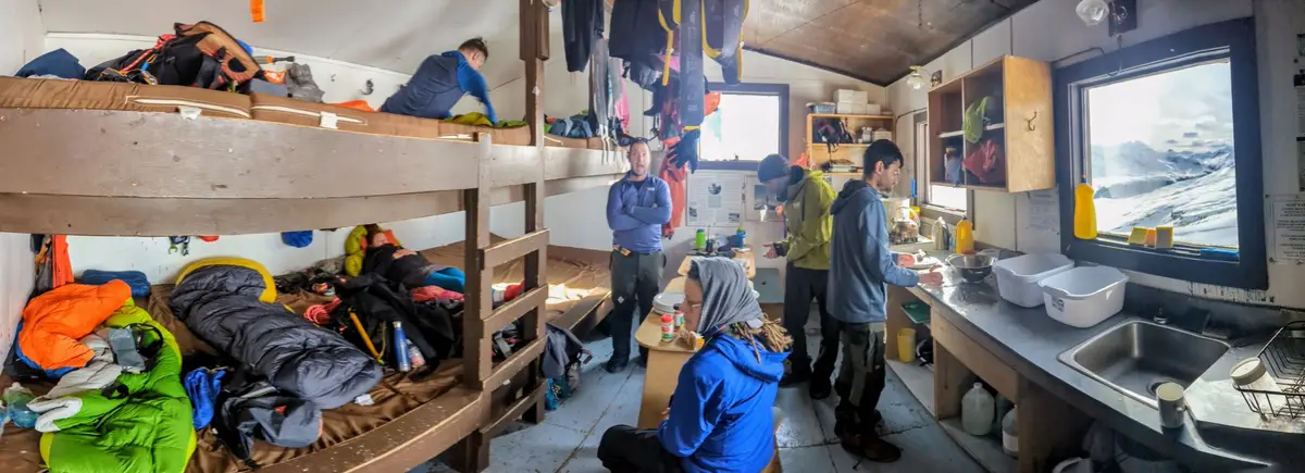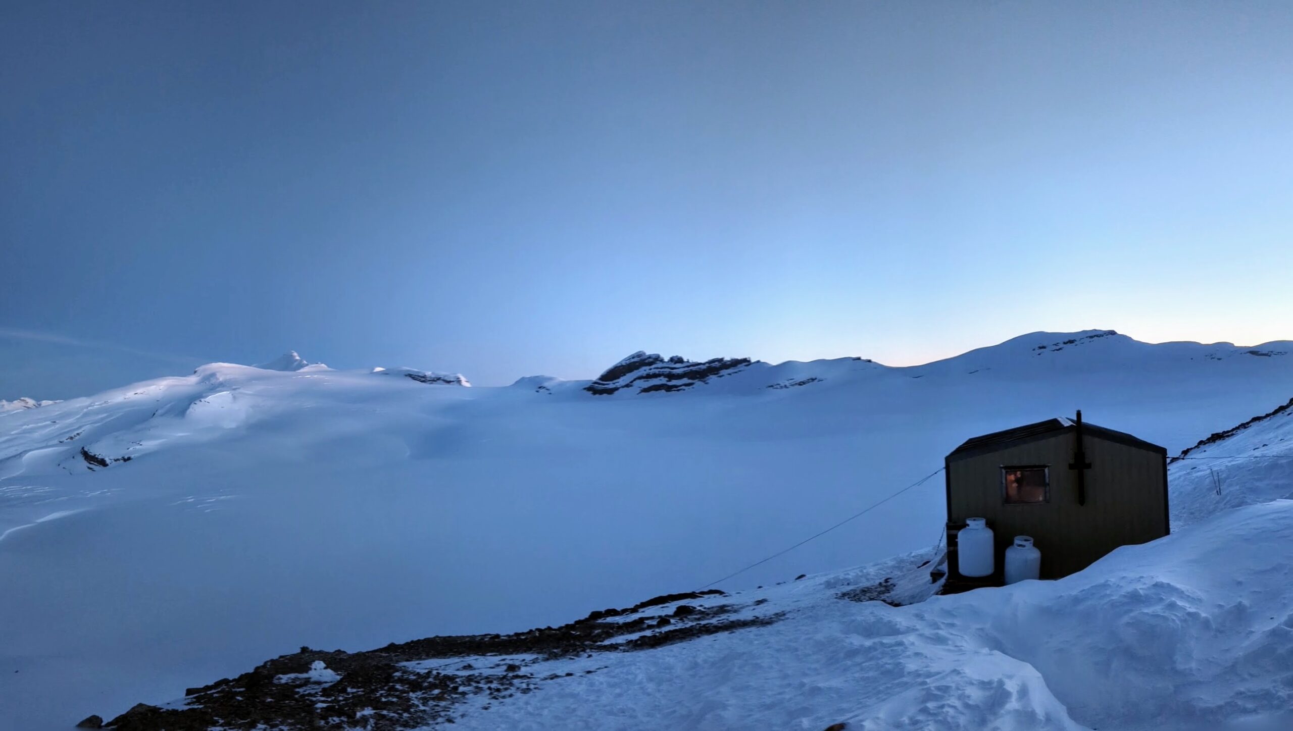 The Scott Duncan Hut feels like a small treehouse with great views and a lot of exposure. There is no vestibule like at the Balfour Hut, so it can be cold and windy when the door opens, and the floor becomes wet with melted snow from boots. We had an excellent shrimp pasta for dinner and then fell asleep to the sound of the wind singing through the cables that hold down the hut.