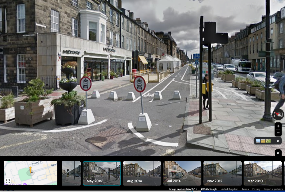For those with a long memory, the council actually did this as an 18-month experiment under an ETRO in 2014-2015. See plans, statement of reasons and this Broughton Spurtle overview and the streetview picture below. The scheme was a considerable success, with surveys showing increased footfall, reduction in car numbers, and people feeling it made the street more pleasant and encouraged them to return.