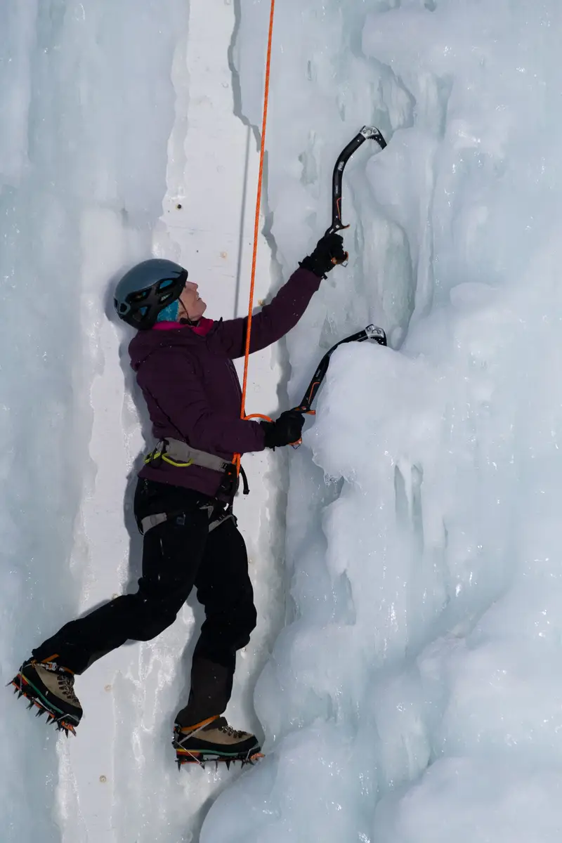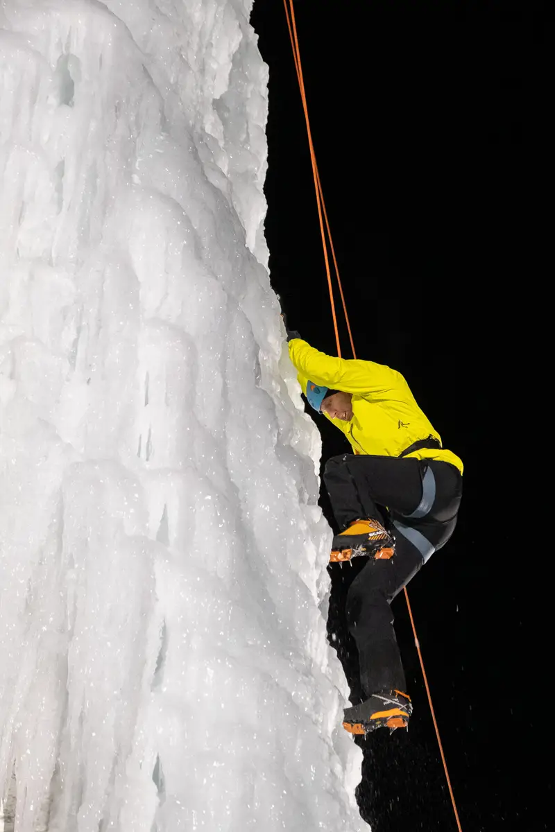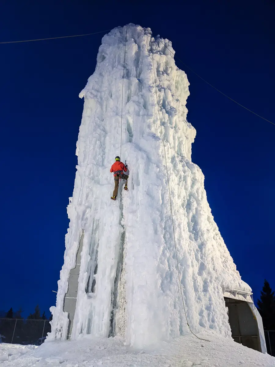 Then come fall, more volunteers remove all the holds and prepare the tower for winter, but it doesn’t hibernate alone. No. Volunteers rig the tower so that it can be flooded on the coldest days of December and climbed with ice axes and crampons all winter. Every year it freezes with new and interesting features and fun routes ranging from WI 4 to WI 5. Supervision of the ice climbing is another massive winter-long job for volunteers.